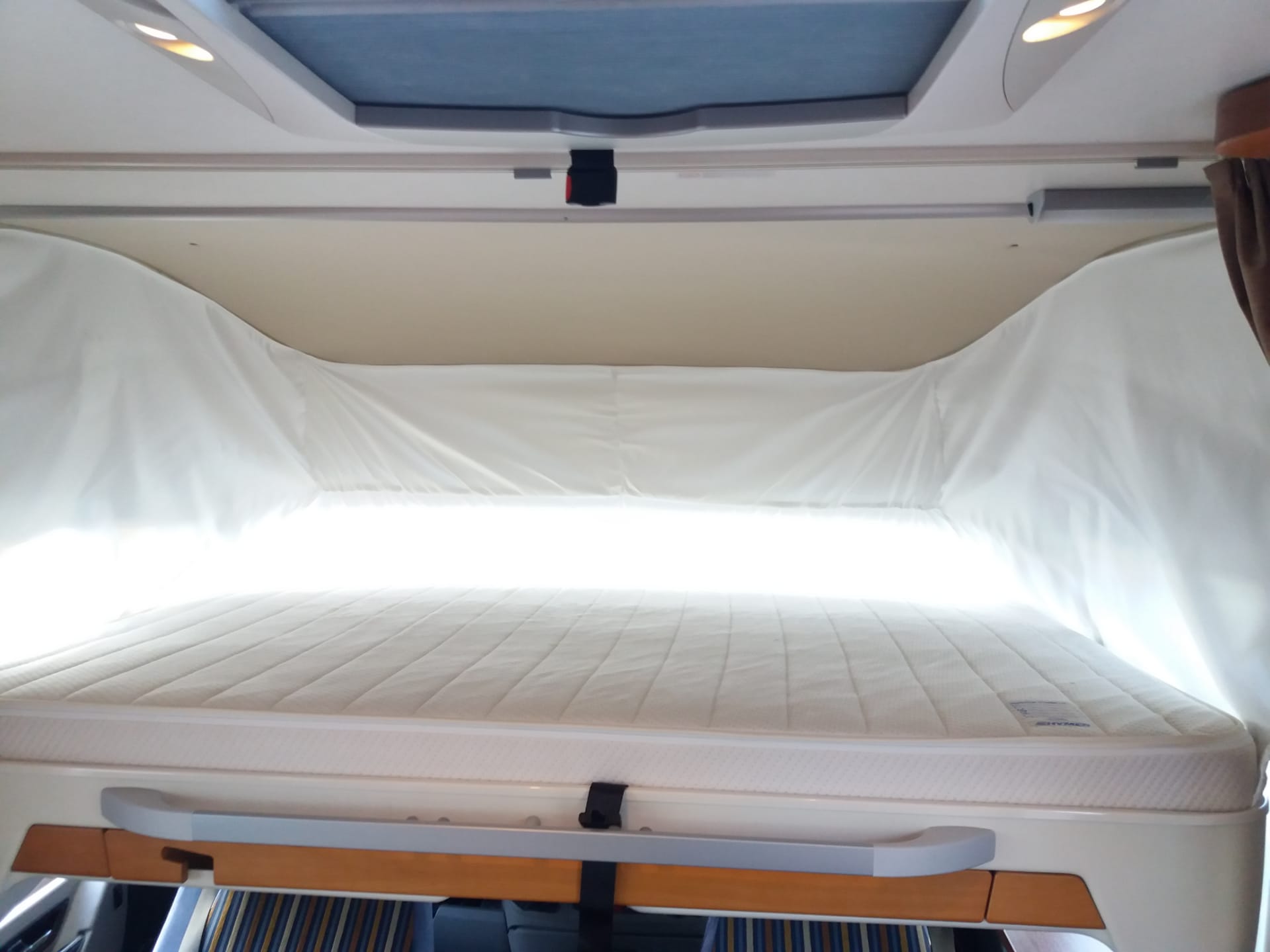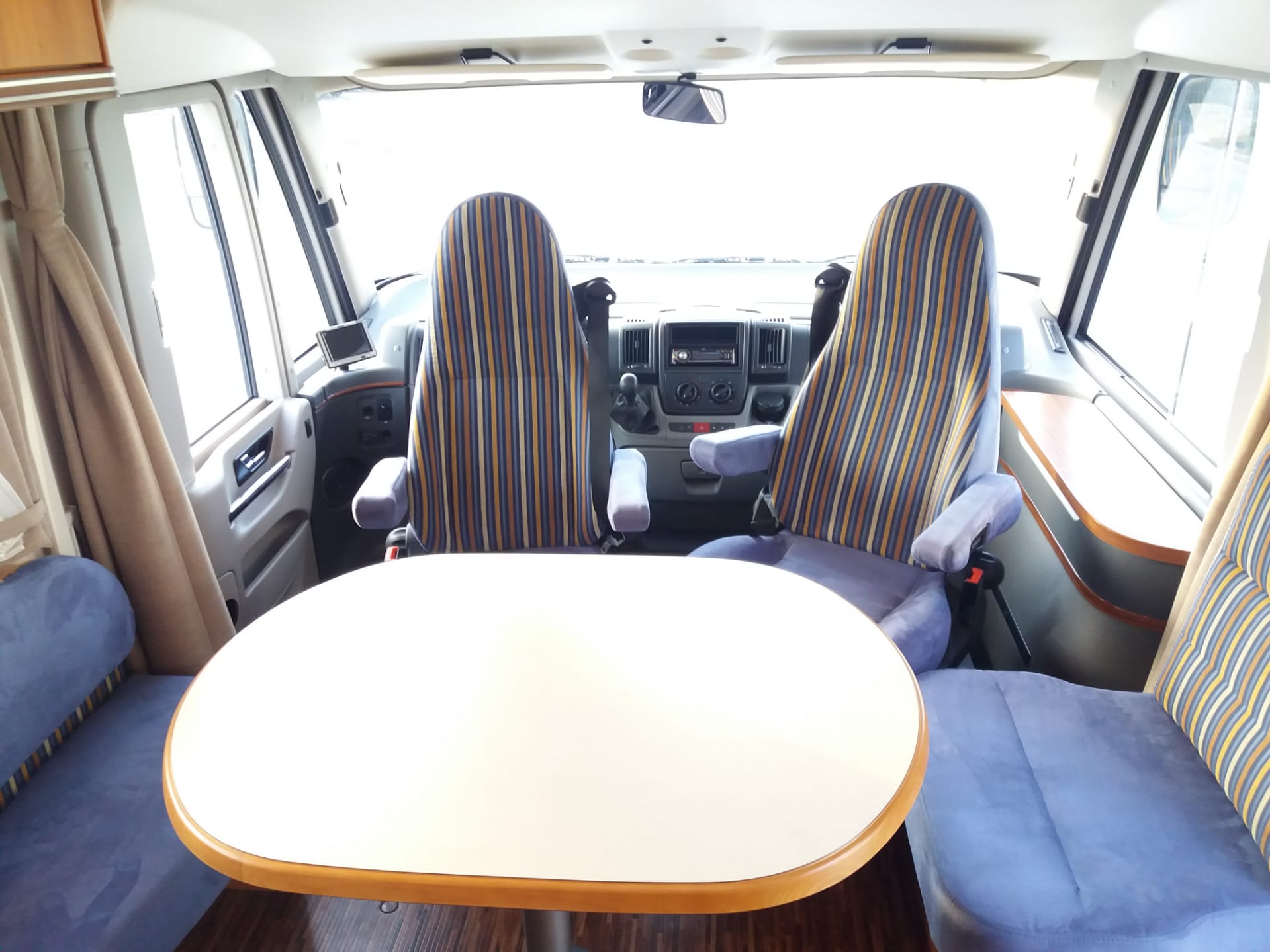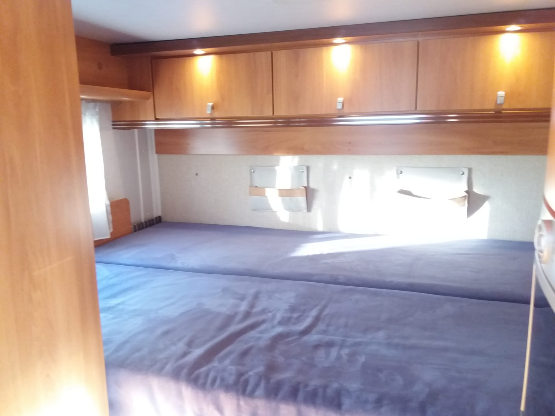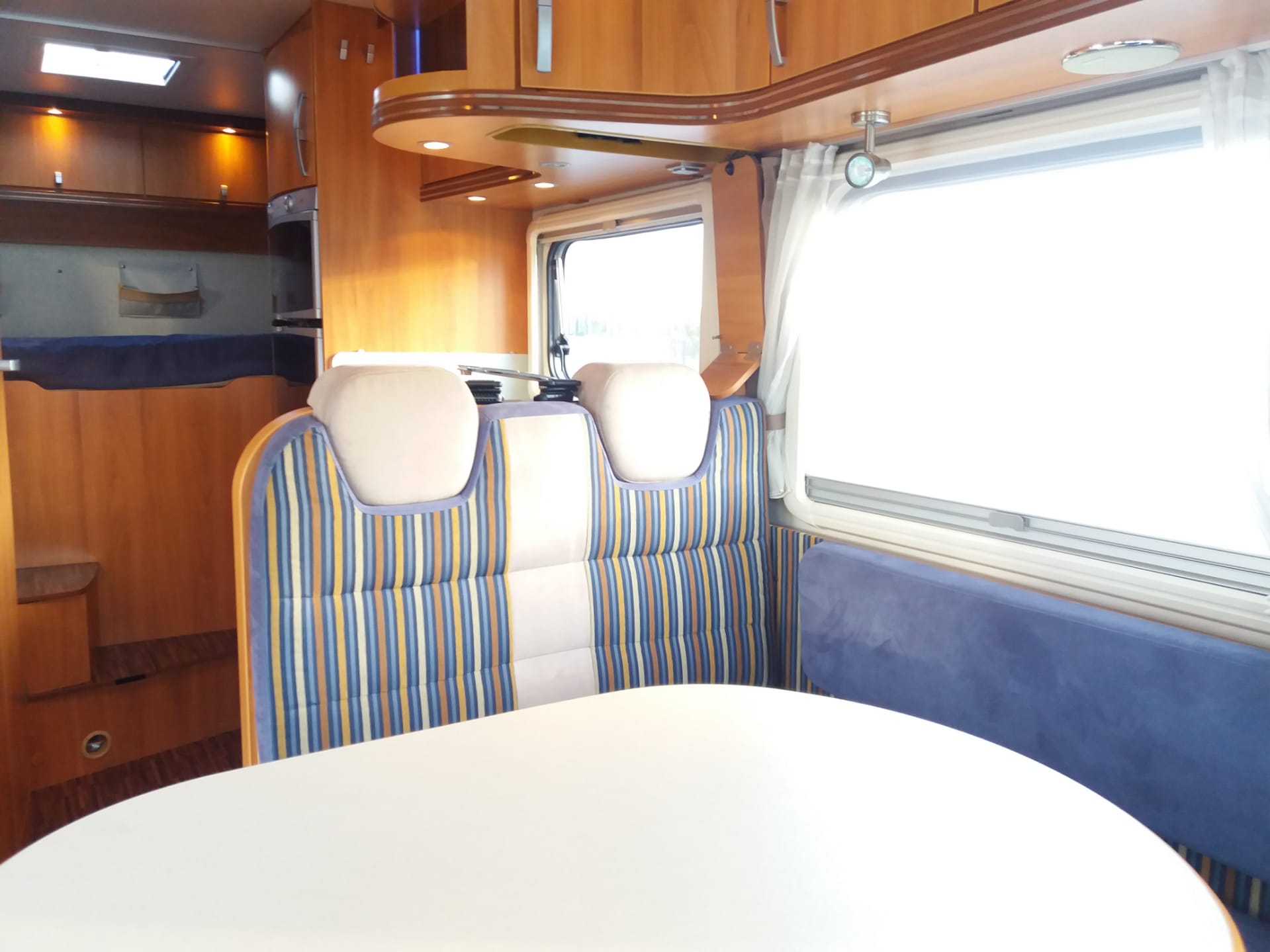 We do love this configuration as it is super comfortable without being too long (6,99m). Indeed, the Hymer B614CL has two permanent beds with enough space for 4 people. There is one crosswise bed in the back and one bed on top of the cabin.