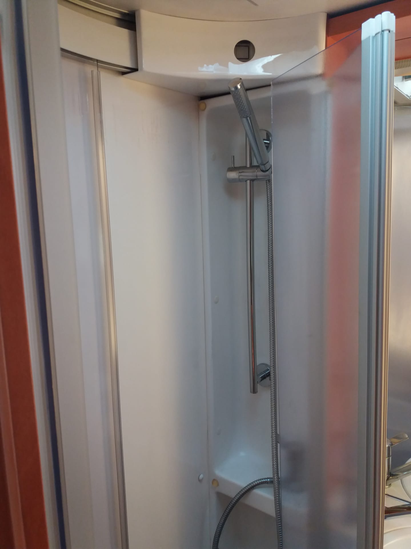The bathroom is a very typical bathroom with a toilet and a separated shower in one room. However, there is a great trick to win some space by moving the sink. This allows us to have a real size shower in our home on wheels.